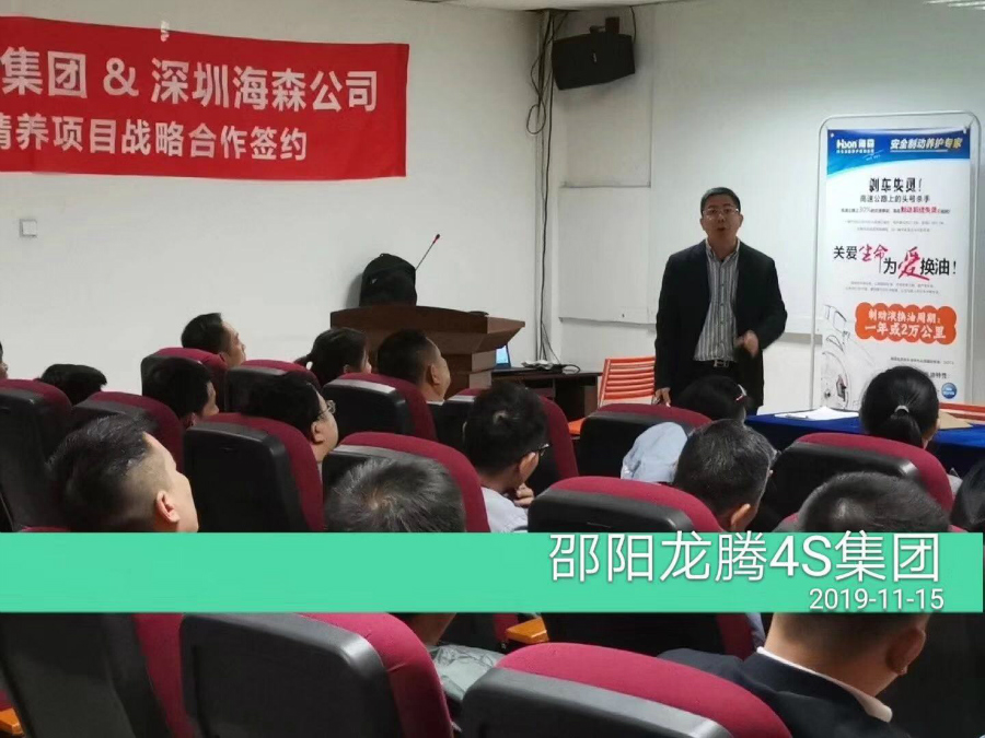 湖南邵阳龙腾汽车4S集团培训会:介绍海森自动变速箱油产品、海森驭温·多元醇冷却液产品、刹车油系列产品、擎魔系列机油产品,还介绍了以上产品的最新更换方法与步骤要领。